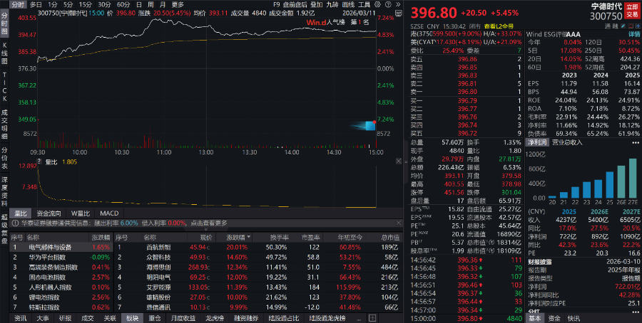 阳光电源(300274.SZ)、宁德时间(300750.SZ)等板块重仓股领涨。其中,宁德时间A股市值冲破1.8万亿元。
