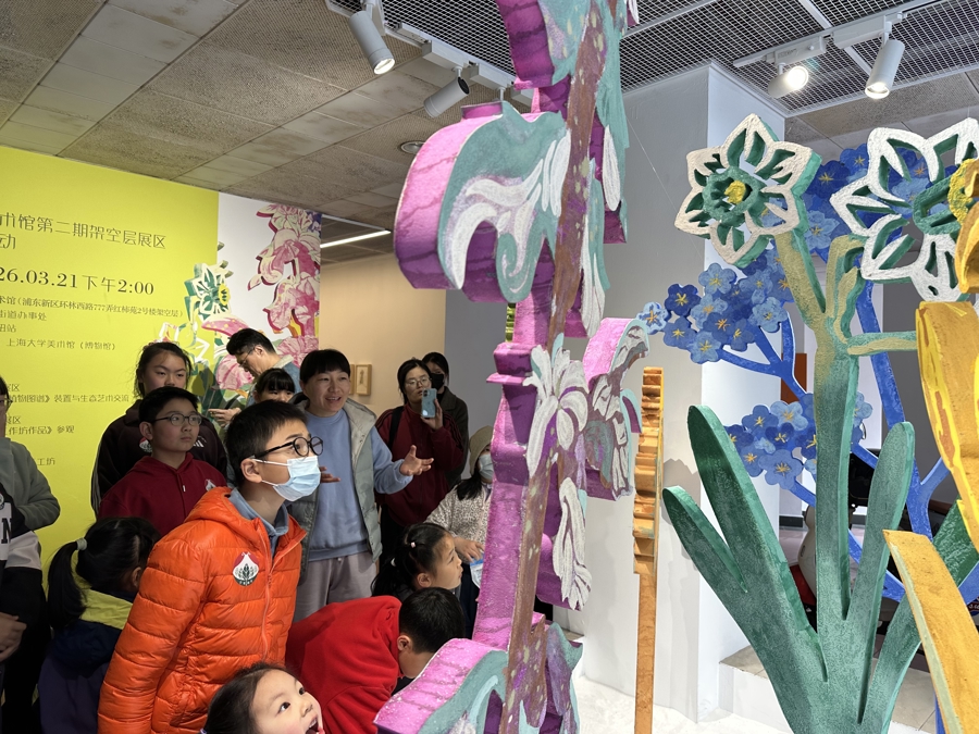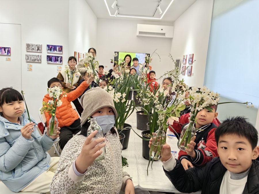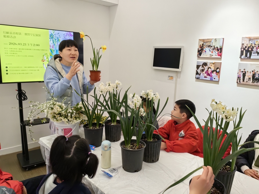 听完教育,小区内的十几位“少年林长”又插足到了好意思术馆寰球空间的《崇明水仙》盆栽植物手工坊中。此时适值崇明水仙的花期,室内开放的真花与室外岩彩绘图的艺术水仙意思意思无限。孩子们在植物大家金梦怡等东谈主的相易下,感受着点线面的插花玄学,致使自愿组织起了社区环境清洁行径,将艺术的触角蔓延至对社区的确生态的保护。
