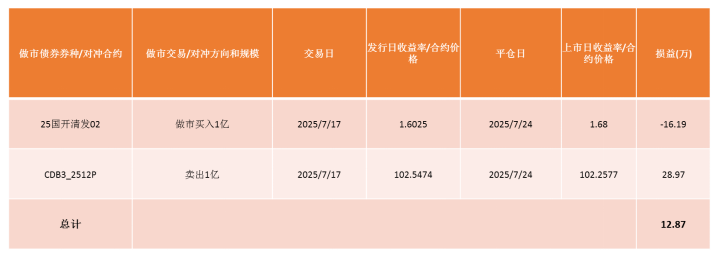 以下表为例,作念市商报出的25国开清发02买入地点被点1亿元。此刻利率正处于上行趋势中,且原有债券卖出价钱较差,需尽快对此敞口进行对冲。此时卖出尺度债券远期合约CDB3_2512P 1亿元,即可对冲债券敞口。执有一周后,尽管执有的债券收益率上行近8BPs,但执有的尺度债券远期合约很好地对冲退回券价钱的着落,使得作念市商不错执续开展债券作念市报价。