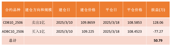 以下表为例,2025年3月10日,国开债-农发债利差涉及-15BPs的历史极低位置,建仓国开-农发跨品种合约套利策略头寸;3月18日,利差权臣回来,仇敌寸进行平仓。