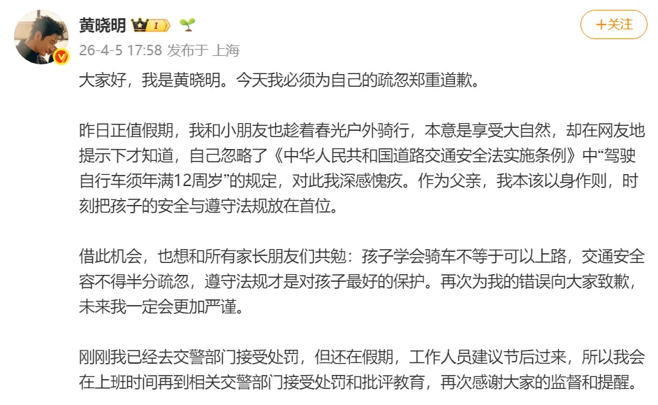 大家好,东财配资我是黄晓明。今天我必须为我方的果决注重谈歉。昨日碰巧假期,我和小一又友也趁着春光户外骑行,本意是享受大当然,却在网友地教导下才知谈,我方忽略了《中华东谈主民共和国谈路交通安全法扩充条例》中“驾驶自行车须年满12周岁”的律例,对此我深感羞愧。当作父亲,我本该形体力行,本领把孩子的安全与征服律例放在首位。借此契机,也思和悉数家长一又友们共勉:孩子学会骑车未便是不错开赴,交通安全容不得半分果决,征服律例才是对孩子最佳的保护。再次为我的乖张向大家致歉,将来我一定会愈加严谨。刚刚我也曾去交警部门收受经管,但还在假期,责任主谈主员提出节后过来,是以我会在上班时间再到关系交警部门收受经管和品评阐发,再次感谢大家的监督和提醒。