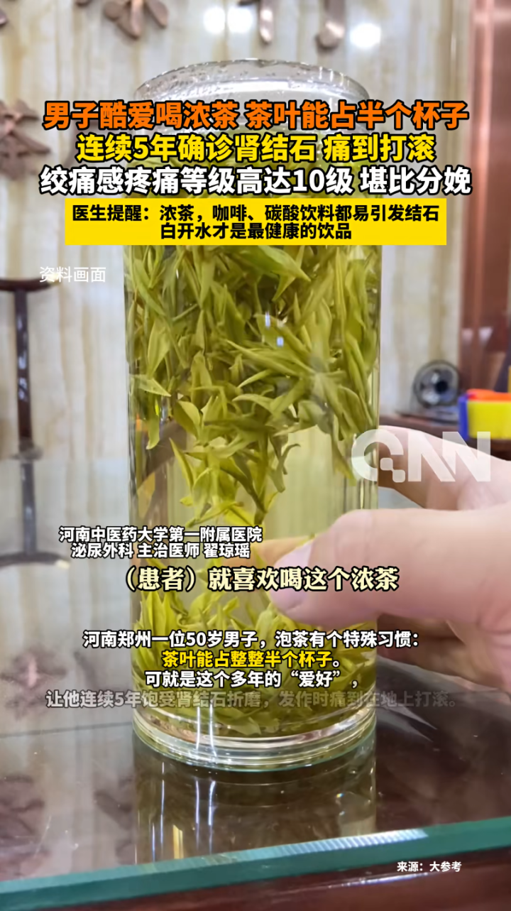 河南郑州一位50岁男人,有个多年的喝茶民俗:沏茶时茶叶险些占满半个杯子。遥远喝浓茶,让他聚积5年饱受肾结石困扰,发作时痛得在地上打滚。