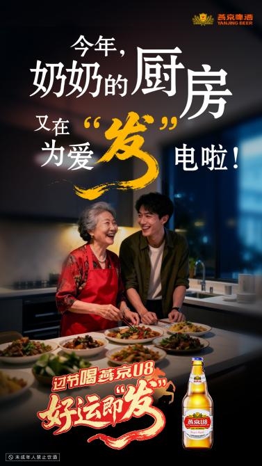 燕京啤酒将自己定位为春节情感的“催化剂”与“见证者”。春节团聚,亲友举杯,桌上的燕京U8,因为一系列暖心铺垫,被赋予更多团聚、欢乐的情感内涵,自然融入欢庆场景。可以说,燕京啤酒正在将自己建设成为特定时节(如春节)不可或缺的“情感基础设施”的一部分——当人们想到温暖、团圆、吉庆,便能关联起品牌带来的那一份暖心触动。