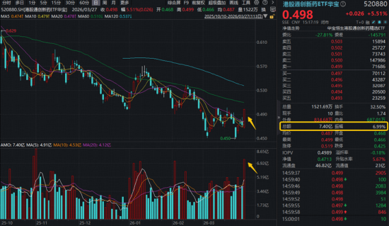 AH医药财富中,港股通翻新药涨势最为强盛!港股通翻新药ETF华宝(520880)尽显高弹性,全天振幅近7%,盘中最激越至5.72%,超长大阳线强势“阳包阴”。场内交投尤为活跃,单日成交7.4亿元,较昨日大增草率,创近4个半月来新高!