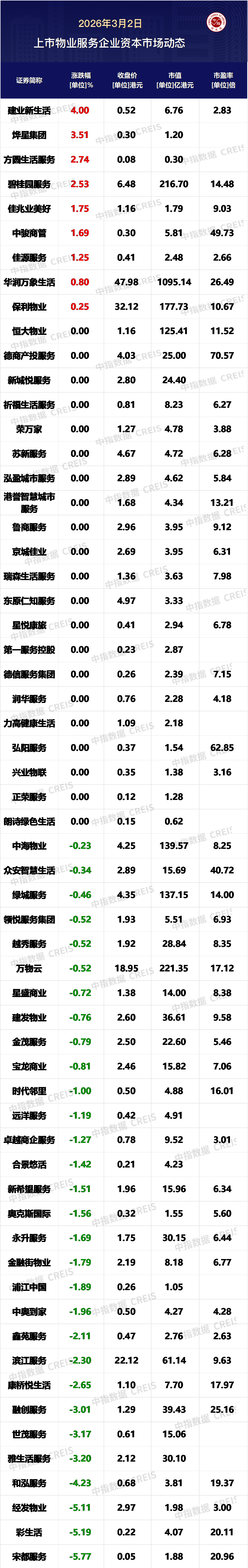 3月2日,恒生指数,收盘下落570.69点,跌幅约为2.14%,报收26059.85点。当天60家港股上市物业管事企业中9家飞腾。建业重生计涨幅为4.00%,位列当天港股物业管事板块第一位。