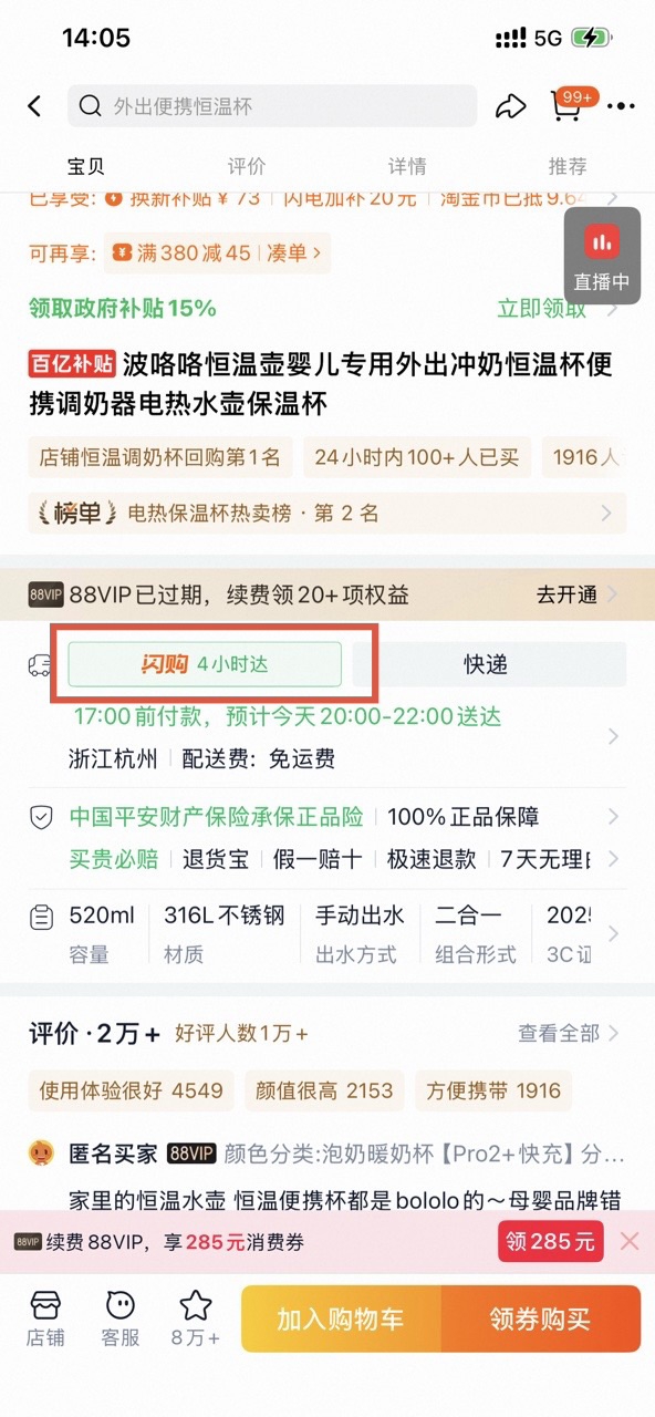 第一批开通闪购的天猫品牌已率先收获销量新增长。“自今年1月上线闪购服务以来,破壁机单品通过闪购仓快速送达消费者,销量提升30%以上。”九阳品牌电商负责人介绍,因为配送时效快,物流分高,提高了店铺流量,打“闪购”标的商品订单转化率也明显提升了。