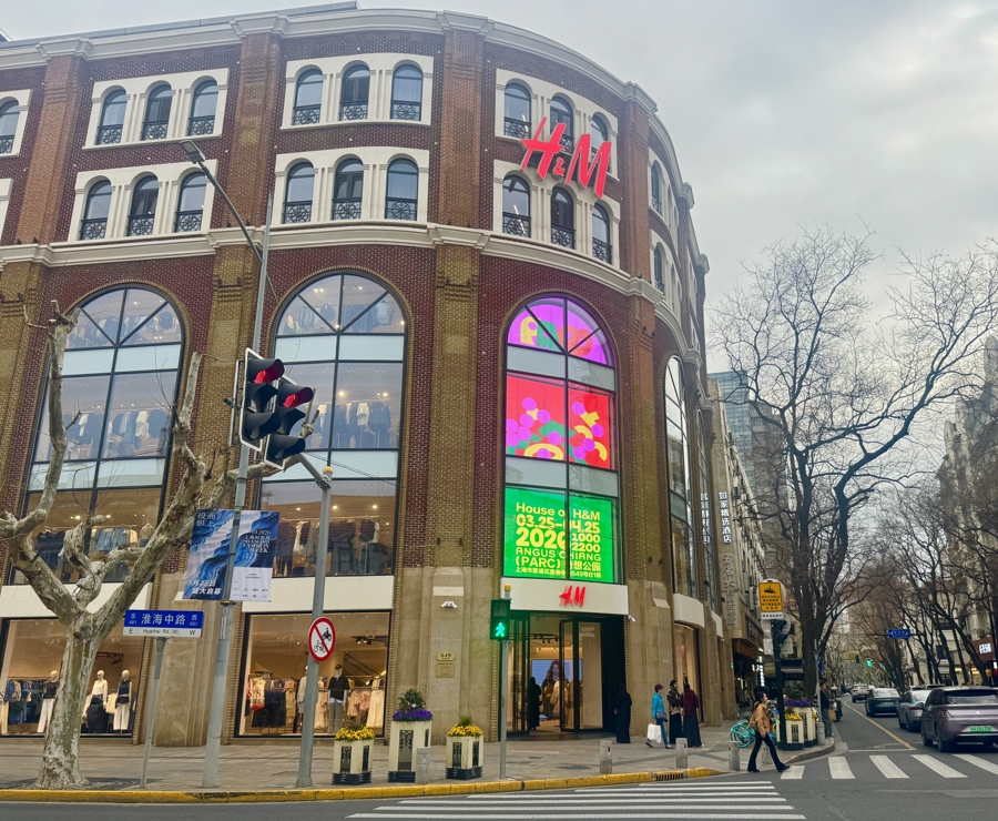 记者在现场看到,H&M淮海路旗舰店被色调包围,从大屏灯箱到玻璃橱窗,跃动的奇趣渲染了整座店铺。